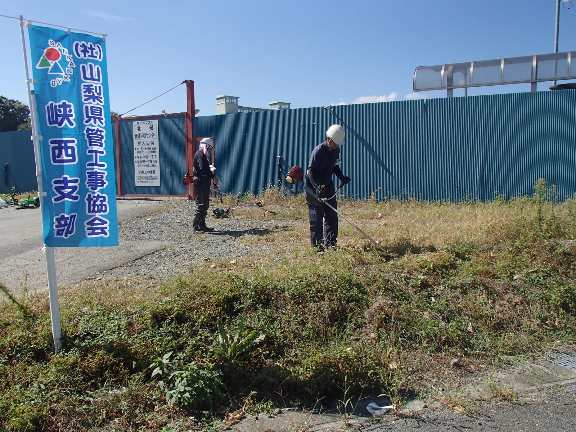 峡西支部では10月1日(火)に北部資源回収センター北側の斜面及び水路廻りの草刈り及び施設に面する歩道の清掃を行いました。